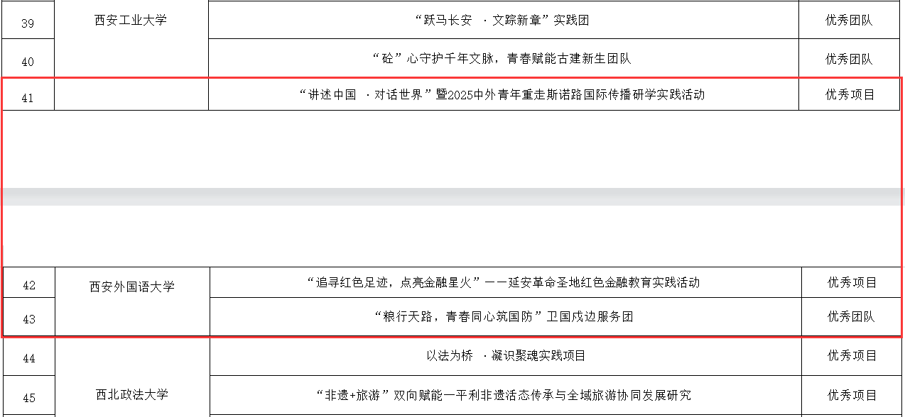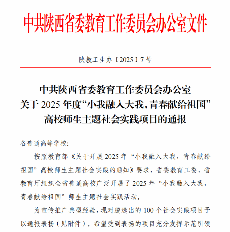 近日,省委教育工委公布了2025年“小我融入大我,青春献给祖国”高校师生主题社会实践100个遴选项目。在2025年暑期“三下乡”社会实践活动中,我校推报的《“讲述中国·对话世界”暨2025中外青年重走斯诺路国际传播研学实践活动》《“追寻红色足迹,点亮金融星火”——延安革命圣地红色金融教育实践活动》和《“粮行天路,青春同心筑国防”卫国戍边服务团》3个项目入选,并获全省通报表扬。