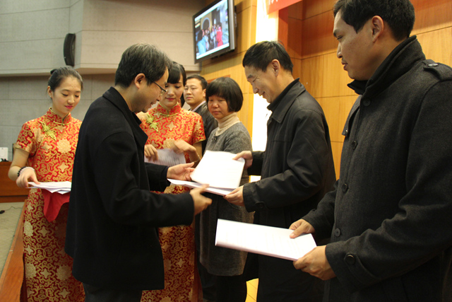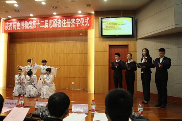 在注册仪式上,陕西历史博物馆馆长成建正在开场致辞中赞扬了每一位在博物馆光荣奉献的志愿者,并肯定了志愿者们一年中的工作成绩。在陕西历史博物馆今年的评优活动中,根据出勤率及讲解批数的最终核算,来自全省13个高校讲解队中共产生了百余名优秀志愿者以及十名“2013年陕历博十佳志愿者之星”,其中我校有1名队员被评为“十佳志愿者之星”,8名队员被评为优秀志愿者,郭建平老师和王倩老师分别为获奖同学颁发了证书。我校同学还代表全体志愿者为与会成员带来了精彩的唐舞配诗朗诵《青花瓷》,为注册仪式增光添彩,充分体现了我校学生的优秀素质和风采。