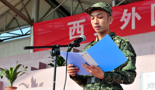 学校隆重举行2014级学生开学典礼暨军训动员大会 2014年9月5日上午,我校2014级学生开学典礼暨军训动员大会在校田径运动场隆重举行。校党委书记郝瑜,代理校长刘越莲,校党委副书记王天平、龙治刚,纪委书记张良弼,副校长王峰、党争胜、姜亚军,总会计师李瑞平以及中国人民解放军边防学院教研部政委刘建斌大校、军训教研室副主任杜空军中校、战术教研室沈建强中校等领导出席大会,学校有关职能处室负责人,各学院(部)院长(主任)、党总支书记,军训旅干部及2014级全体新生参加了大会。典礼仪式由王天平副书记主持。 大会在庄严的国歌声中拉开帷幕。郝瑜书记宣布军训动员大会开始并向军训旅授旗。姜亚军副校长宣读军训旅干部任职命令。刘建斌大校代表边防学院作了讲话。艺术学院副院长南华老师和校学生会主席、高级翻译学院2012级刘浏同学分别代表全校教师和在校学生发言。2014级旅游学院江博文同学代表全体新生进行了庄严宣誓,军训旅教官代表、一连连长王延清代表全体训练官兵发言,表达了圆满完成军训任务的信心和决心。 会上,代理校长刘越莲作了热情洋溢而又饱含深情的讲话。她首先代表学校对2014级新同学表示热烈的欢迎,并从学校的发展历程、人才培养和学生实践成果等方面做了简要介绍,向全体新同学展示了一个发展奋进中的西外。接着,刘校长从对西外校训“爱国、勤奋、博学、创新”的解读中对新同学提出了殷切希望。她说,“爱国”不是一句空洞的政治口号,这是西安外国语大学从建校以来就一直秉承的优良传统;“勤奋”是一种把惰性抛之脑后的积极心态,一个人有了这种积极的心态,就能够自觉地学习,掌握更有效的学习方法,养成良好的学习习惯;获取真知的基础就是“博学”,希望同学们充分利用学校提供的平台和条件,开拓视野,丰富自己的知识结构,积极投身各类社会实践活动,努力提升自身综合素质;“创新”是一个民族进步的灵魂,是国家兴旺发达的不竭动力,希望同学们勇于探索未知,敢于突破陈规,不断提高发现问题和解决问题的能力。最后,刘校长勉励所有新同学珍惜大学四年的美好时光,发奋图强,追求卓越,努力成为对国家、对社会、对人民有用的人。 2014级学生开学典礼暨军训动员大会在嘹亮的军歌声中圆满结束。本次学生军训工作从9月4日正式开始将持续到9月17日。(军训旅政治部)