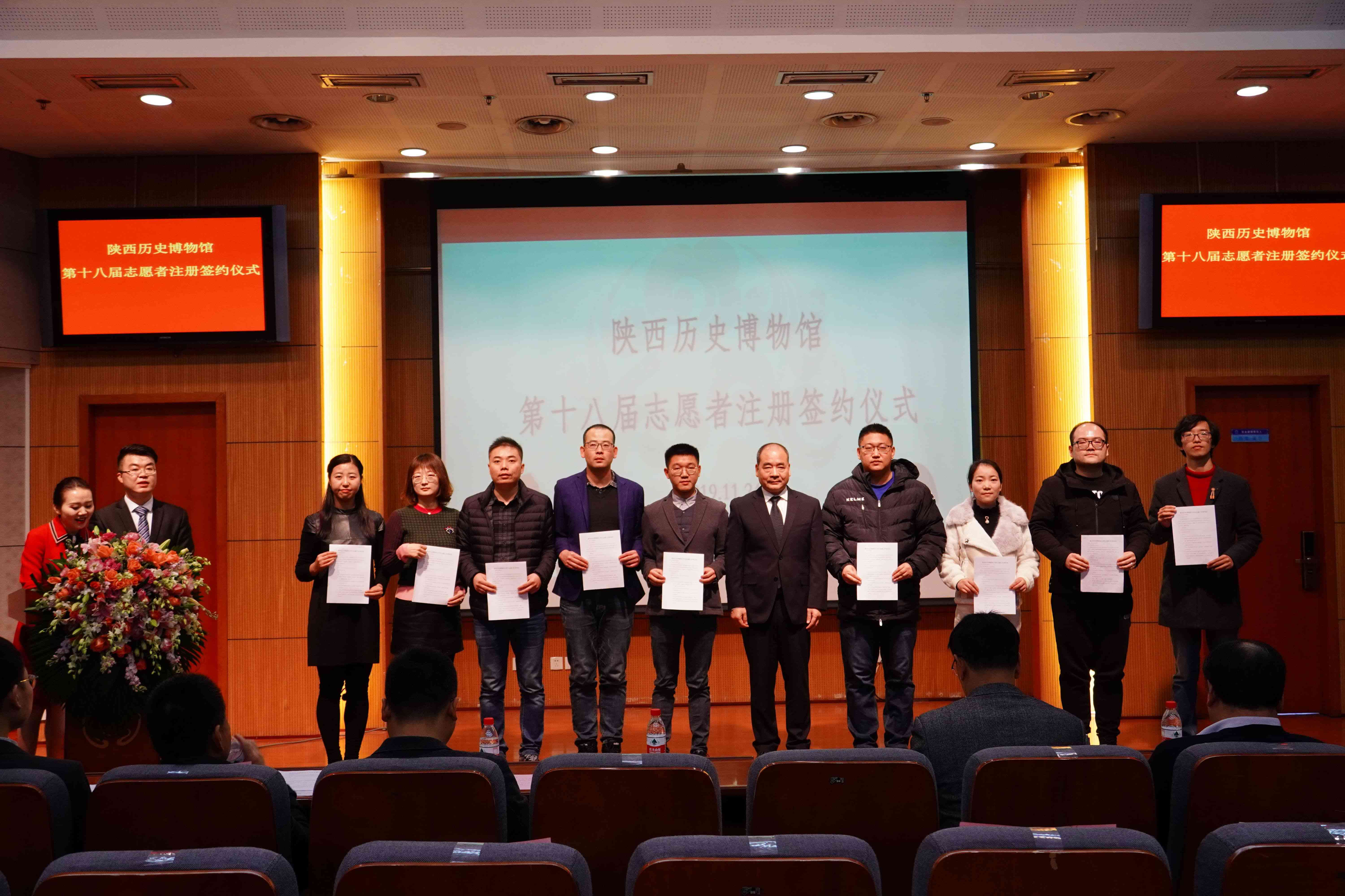 2019年11月24日,陕西历史博物馆第十八届志愿者注册签约仪式在陕西历史博物馆多功能厅举行。陕历博党委书记、馆长侯宁彬,副馆长魏成广以及来自二十所高校的领导、老师、优秀志愿者共计300余人参加了此次注册签约仪式。