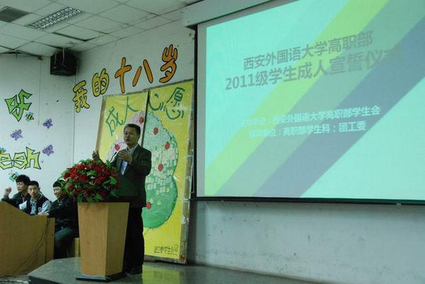 2013年11月27日下午,“2011级学生成人宣誓仪式”在雁塔校区阶梯教室成功举办。高职部党总支书记王锋老师、学生科科长高生民老师、团工委书记周怡杉老师及2011级相关辅导员应邀出席见证同学们的成人宣誓仪式。